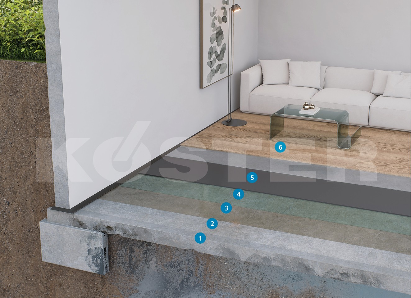 Pentru o solutie completa de hidroizolatie pe substraturi de beton predispuse la infiltrarea umezelii, sistemul incepe cu o pregatire minutioasa prin sablare. apoi se aplica KÖSTER VAP I 2000, o amorsa bariera de vapori conceputa special pentru pardoselile interioare neizolate din beton . Acest material avansat reduce eficient ratele de emisie a vaporilor de umiditate (MVER) si alcalinitatea, asigurand un mediu adecvat pentru diferite tipuri de sisteme de pardoseala. O data ce KÖSTER VAP I 2000 s-a intarit, se aplica amorsa KÖSTER VAP I 06, care pregateste suprafata pentru instalarea ulterioara a KÖSTER SL Premium. Aceasta amorsa pe baza de apa, monocomponenta, este versatila si potrivita atat pentru substraturi absorbante, cat si neabsorbante. In cele din urma, se aplica KÖSTER SL Premium, un strat de baza de inalta calitate, cu priza rapida, care se intareste fara contractie, oferind o suprafata neteda, nivelata, pregatita pentru instalarea diferitelor sisteme de pardoseala. KÖSTER SL Premium poate fi aplicat in grosimi cuprinse intre 5 si 15 mm, se potriveste diferitelor conditii de substrat acesta se autoniveleaza pana la 2 mm si umple denivelari de pana la 30 mm. O data intarit, ofera un strat de nivelare solid, multifunctional, gata sa sustina aplicarea de gresie si alte finisaje, asigurand o solutie de pardoseala durabila si rezistenta.
