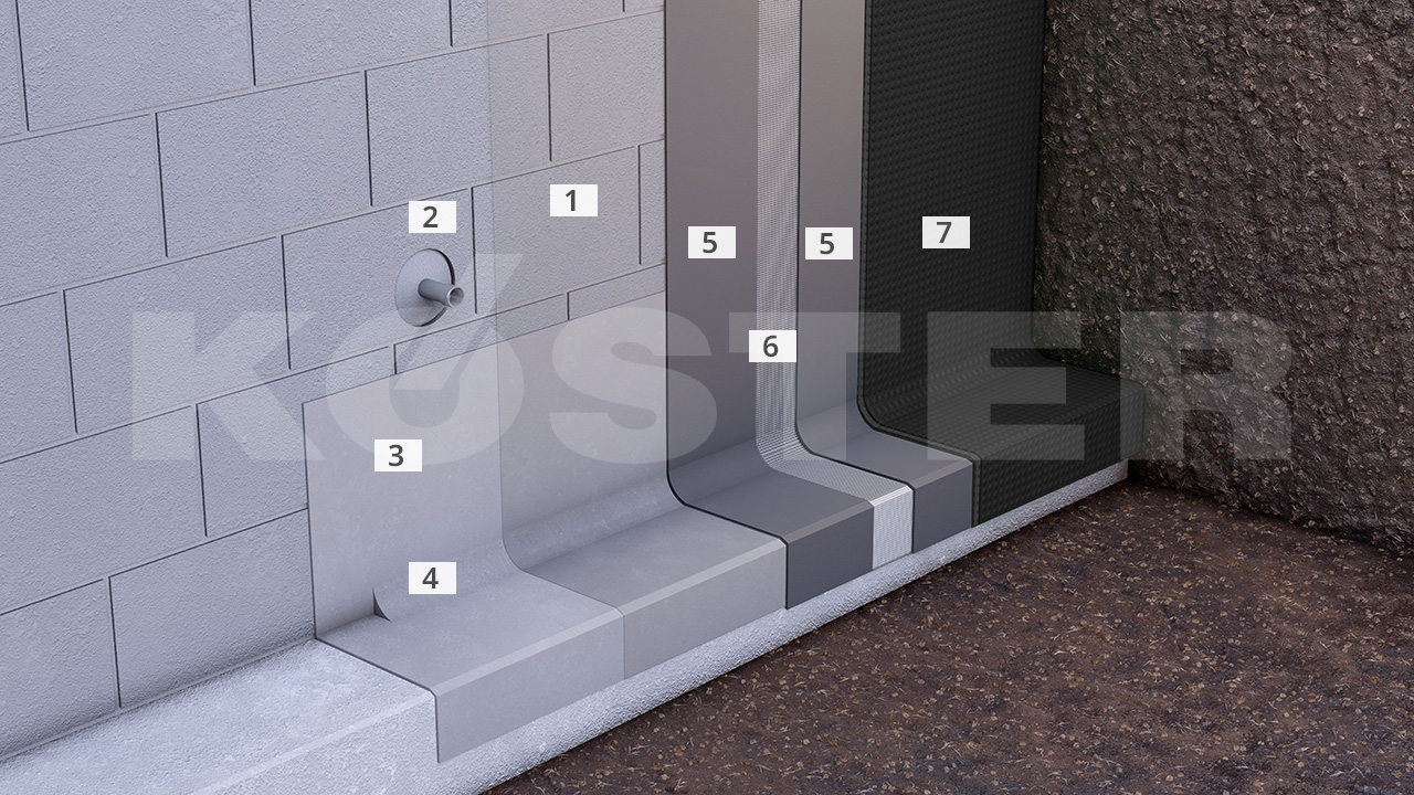 Hidroizolaţia propriu-zisă este realizată folosind KÖSTER NB Elastic Gri sau KÖSTER NB Elastic Alb în două straturi. Aplicarea produsului KÖSTER Flex Fabric este recomandat să fie făcută între cele două straturi de impermeabilizare pentru realizarea unui strat hidroizolant cu caracteristici vâsco-plastice. În special în zonele cu pericol de infiltraţii din spatele hidroizolaţiei, cum ar fi rosturile dintre perete şi podea, trebuie tratat stratul suport cu KÖSTER NB 1 Gri amestecat cu KÖSTER NB 1 Flex. Pentru a evita tensiunile în hidroizolarea elastică, trebuie făcute scafe din mortar de reparaţie KÖSTER în colţurile interioare.