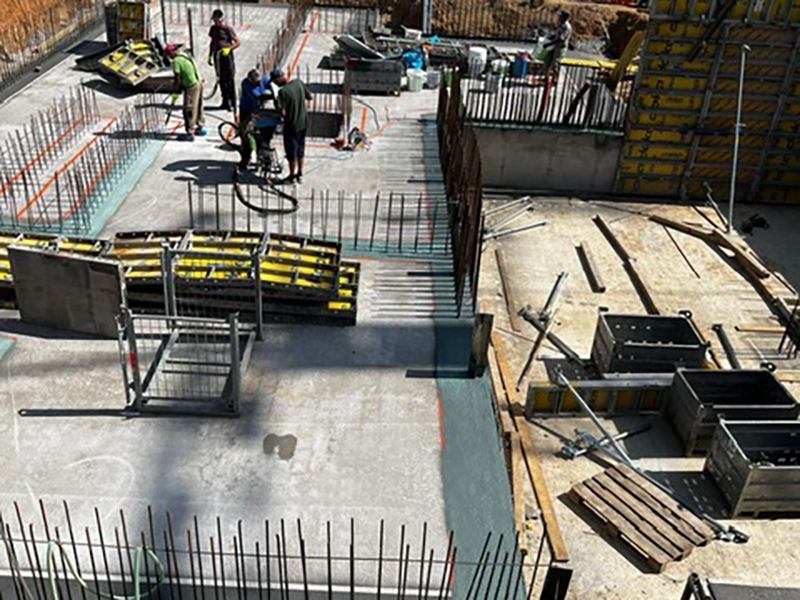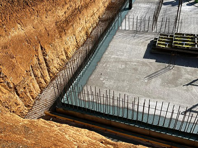 Application of sprayed horizontal waterproofing with metal reinforcement prior to concreting the vertical wall.