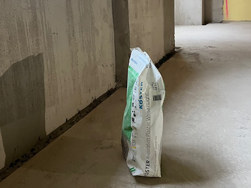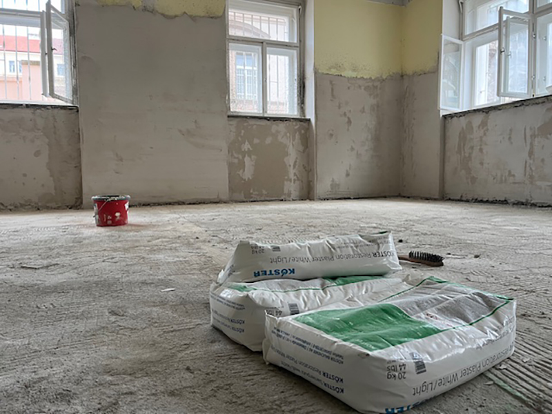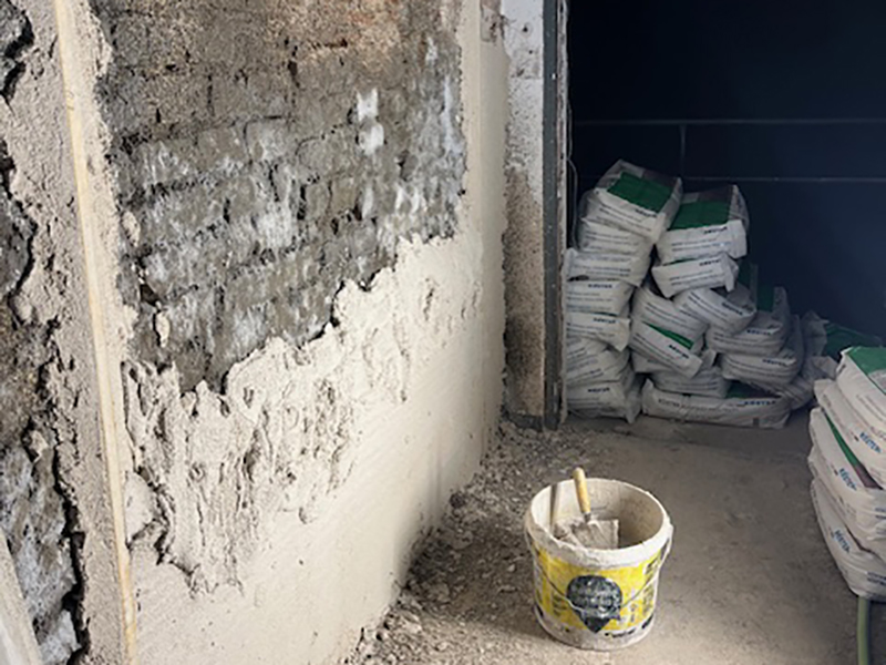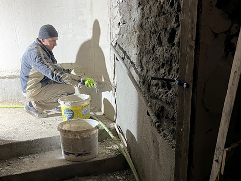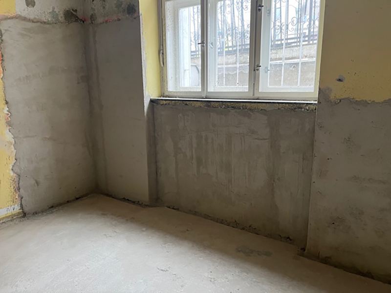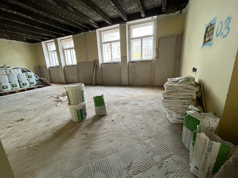 Internal and external waterproofing in existing buildings: Waterproofing the damp basement walls was essential for the basement rooms to be used. In areas where the external walls could be exposed, external waterproofing was applied using KÖSTER NB 4000. First, the substrate was levelled with KÖSTER WP Mortar and primed with KÖSTER Polysil TG 500. Certain areas of the basement walls could not be exposed from the outside, so internal waterproofing consisting of KÖSTER NB 1 Grey was applied. Here too, the substrate was levelled and the coving was created using KÖSTER WP Mortar. Due to the salt content of the walls, the salt-binding and substrate-strengthening primer KÖSTER Polysil TG 500 was used. The diffusion-open and hydrophobic KÖSTER Restoration Plaster enables the masonry to dry out without damage. The salts that have been introduced can crystallise in the pore structure of the renovation plaster without damaging the plaster or subsequent coats of paint.